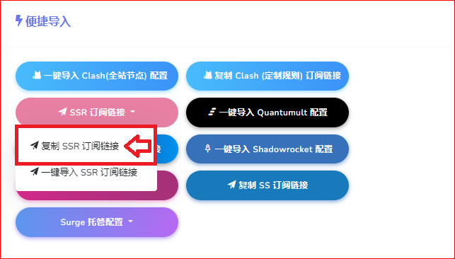 <figure><img src="https://3624672706-files.gitbook.io/~/files/v0/b/gitbook-x-prod.appspot.com/o/spaces%2FouXX89acwT130p8Fr9vI%2Fuploads%2FKDQH0BdvXwDeTgviOaYf%2Fimage.png?alt=media&#x26;token=9c629d5e-60b0-4dae-bb83-d3b4413814bf" alt=""><figcaption><p><strong>鼠标点击 复制SSR订阅链接</strong></p></figcaption></figure>
